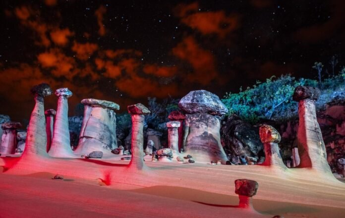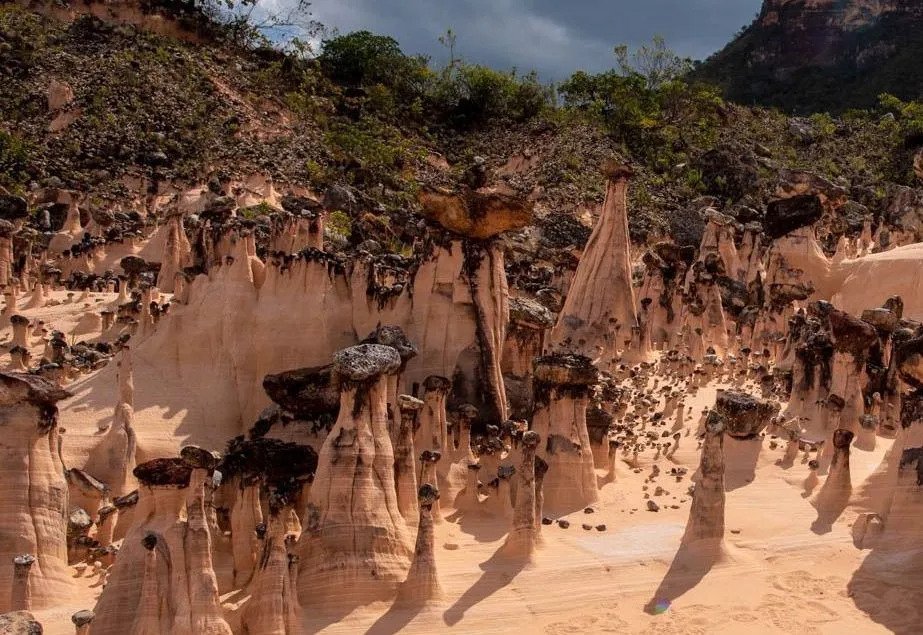 Uma descoberta inédita no Brasil revelou formações geológicas até então conhecidas apenas em outros continentes: as chamadas “chaminés de fada”, estruturas esculpidas pela natureza que lembram colunas de pedra com grandes rochas equilibradas no topo. O achado aconteceu no município de Campos Belos, no nordeste de Goiás, próximo à divisa com o Tocantins e a Bahia.
