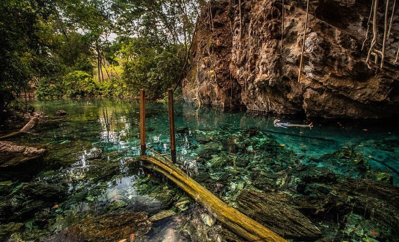 A Lagoa do Japonês possui formações rochosas de calcário que criam cavernas e passagens submersas, ideais para mergulho livre e flutuação com snorkel. A visibilidade da água impressiona, permitindo enxergar o fundo com nitidez e revelando um cenário de pedras esculpidas pela erosão natural ao longo de milhares de anos.