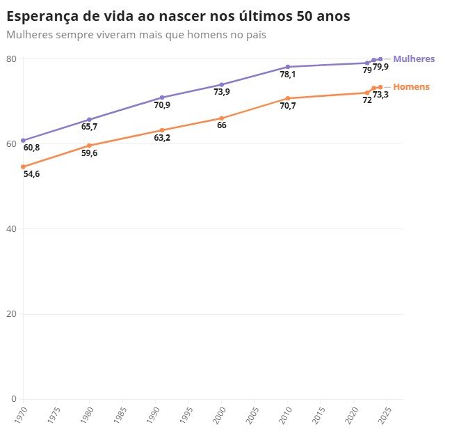 - Expectativa de vida das mulheres em 2024: 79,9 anos