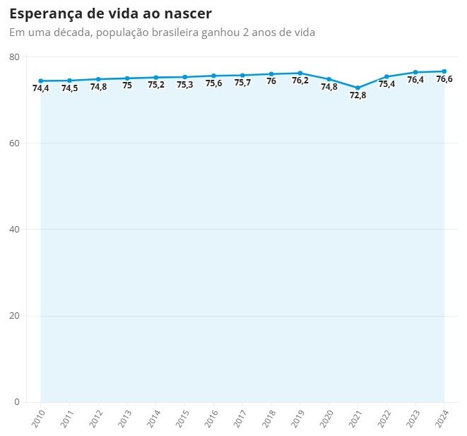 A expectativa de vida ao nascer no Brasil chegou a 76,6 anos em 2024, segundo novas projeções do Instituto Brasileiro de Geografia e Estatística (IBGE). O número confirma a trajetória de recuperação depois do impacto da pandemia de Covid-19, que derrubou a média nacional para 72,8 anos em 2021, e supera o dado de 2023, quando o indicador estava em 76,4 anos.