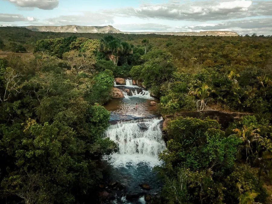 Cachoeira da Palmeira, São Domingos (GO) — Cercada por paredões de rocha e vegetação exuberante, a Cachoeira da Palmeira é um dos refúgios mais belos do Parque Terra Ronca, onde o Cerrado revela toda sua força e tranquilidade.