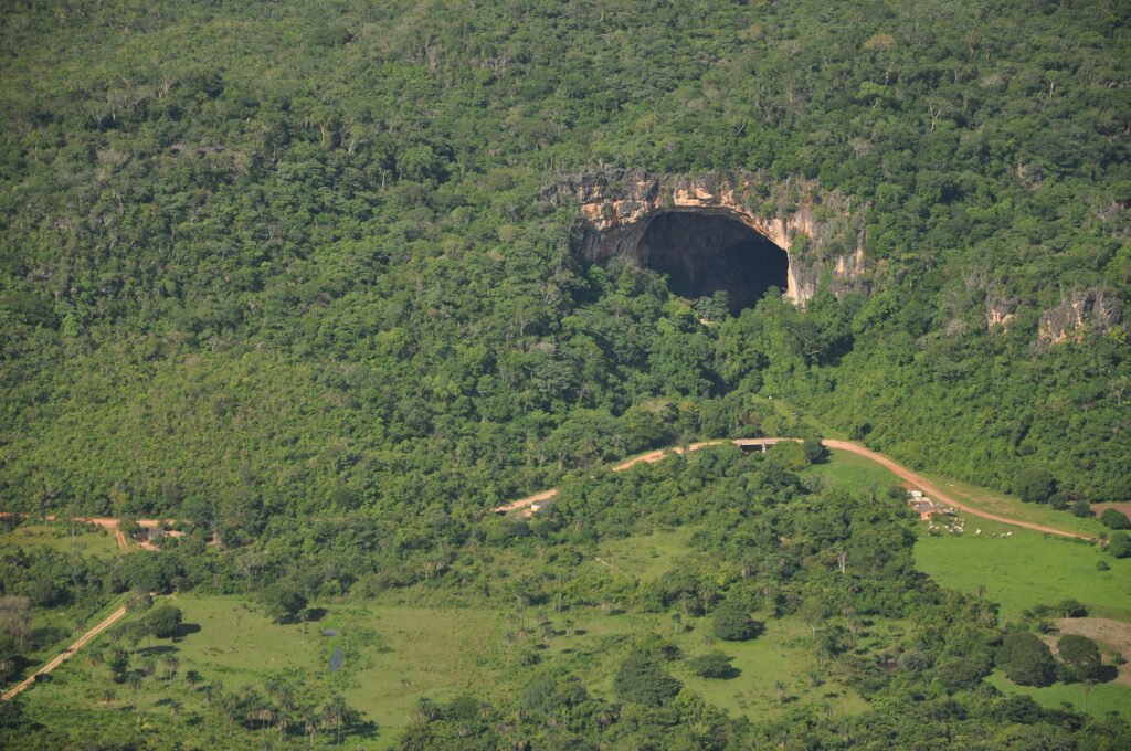 Vista aérea da Gruta Terra Ronca, em São Domingos (GO) — Um dos maiores complexos de cavernas da América Latina, o Parque Estadual da Terra Ronca impressiona pela grandiosidade e beleza de suas formações, símbolo do potencial do espeleoturismo em Goiás.