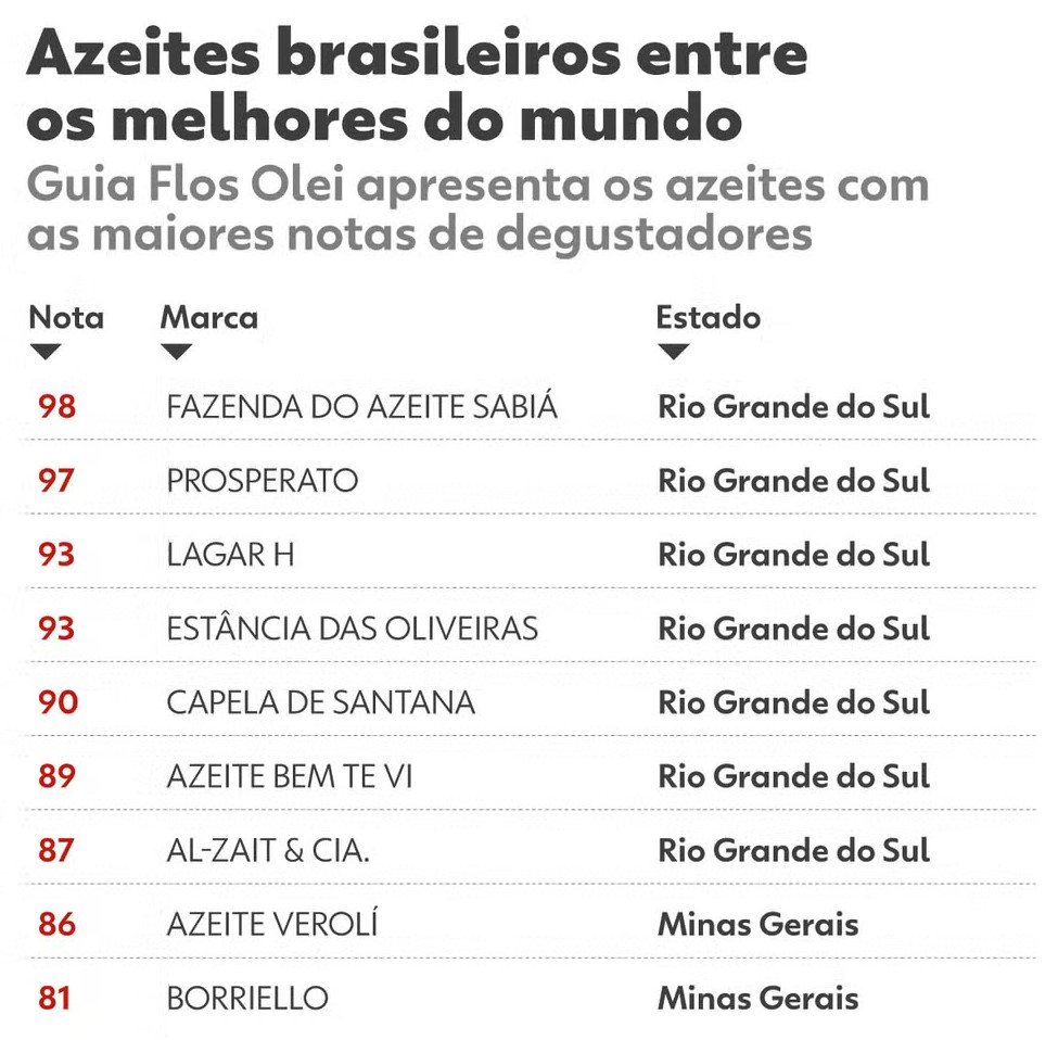 Na edição de 2026, o Brasil aparece com destaque graças à força da produção gaúcha e mineira. Das nove marcas selecionadas, sete são do Rio Grande do Sul e duas de Minas Gerais, estados que vêm se consolidando como polos de produção de azeites de alta qualidade.